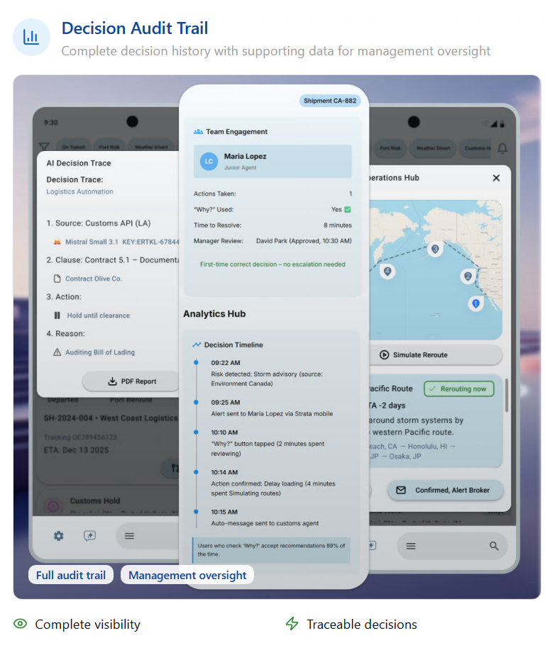 Strata’s AI layer offers transparent reporting through detailed, source-attributed outputs that clearly explain the rationale behind each decision. Every action is logged in a comprehensive decision audit trail, providing full visibility into the system’s reasoning and supporting data—empowering management with oversight, accountability, and traceable intelligence.